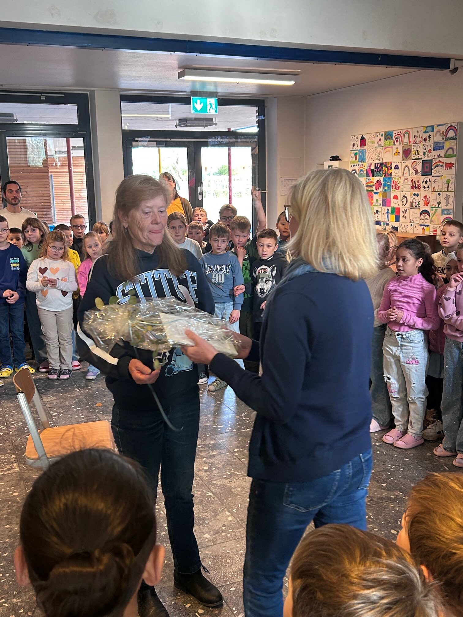 Die Kinder und alle Mitarbeiter der Schule haben sich mit unserem Schullied „Mit vielen bunten Farben“ bedankt und verabschiedet und wünschen „unserer Angelika“ einen wunderbaren Ruhestand.